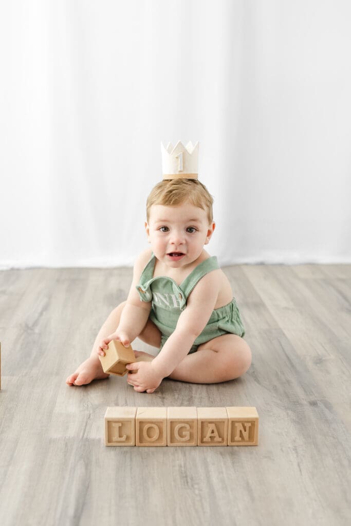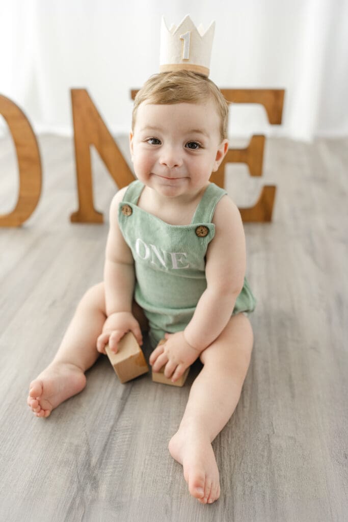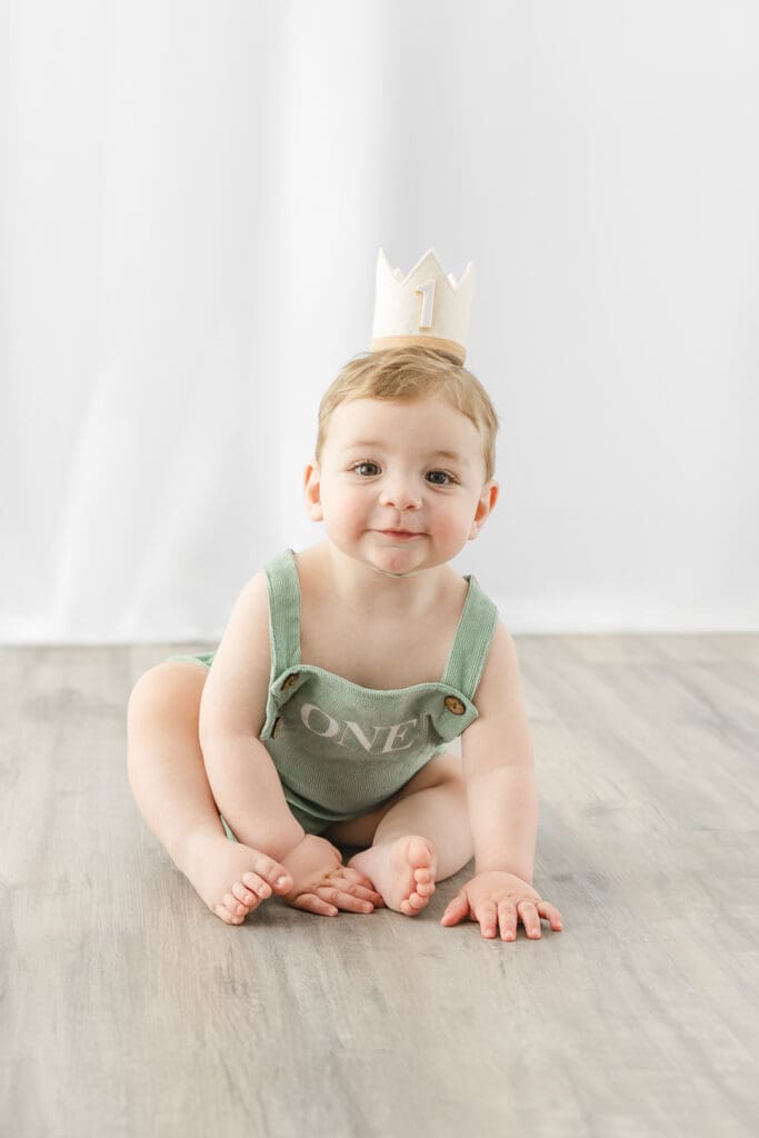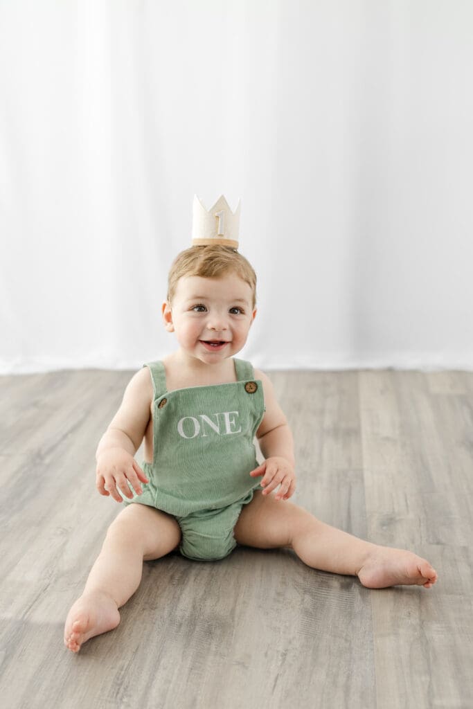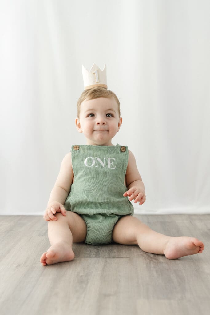 I always begin cake smash sessions with a few classic portraits. With a soft, neutral background and minimal distractions, these images are all about capturing your little one just as they are, bright eyes, curious hands, and that signature one-year-old grin. These timeless photos are a beautiful keepsake before things get a little messy!