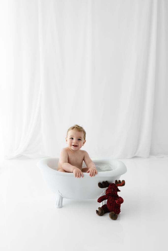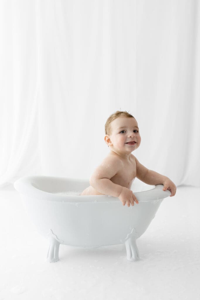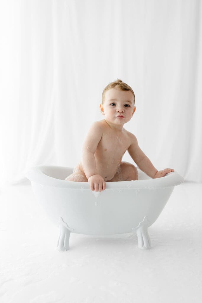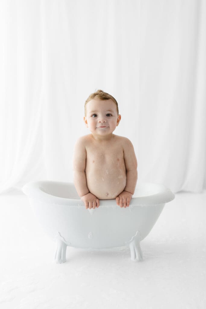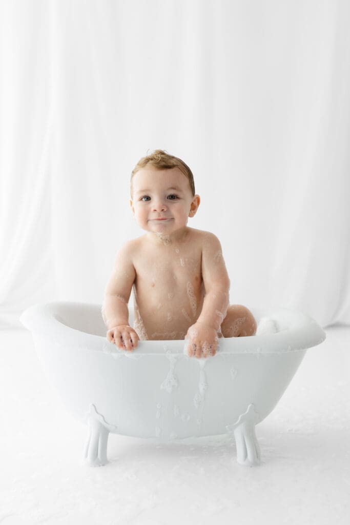 To wrap up the celebration (and clean off the frosting), we moved into the splash portion, a bubbly soak in a vintage mini tub. This is not only adorable but also gives me a chance to capture playful, lighthearted images while your little one enjoys splashing around. Logan had an absolute blast, and the tub was the perfect way to end the session on a high note.